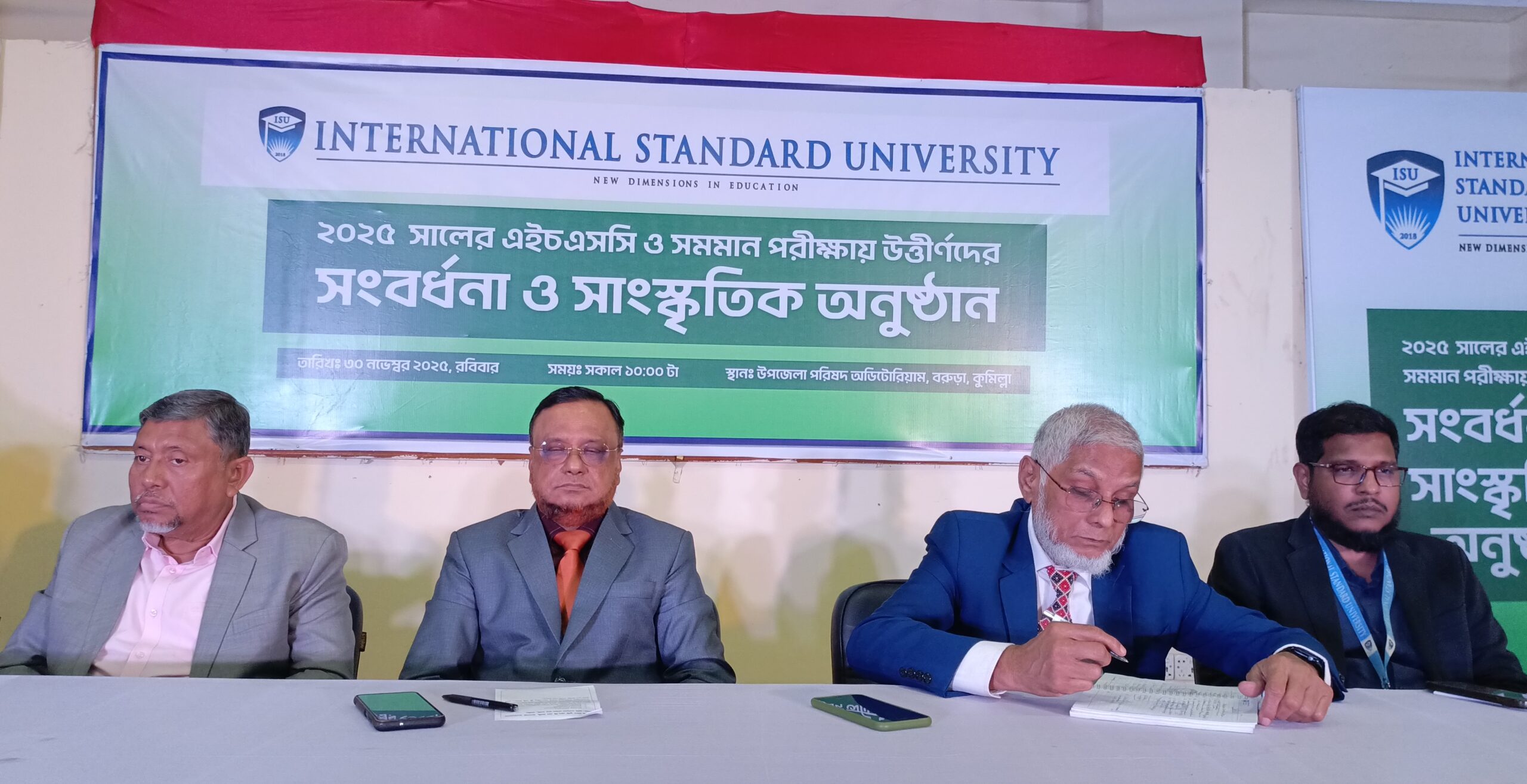 ইন্টারন্যাশনাল স্ট্যান্ডার্ড ইউনিভার্সিটি (আইএসইউ) এর আয়োজনে এইচএসসি ও সমমান পরীক্ষায় ২০২৫ সালের উত্তীর্ণ শিক্ষার্থীদের সংবর্ধনা অনুষ্ঠিত হয়েছে। ৩০ নভেম্বর ২০২৫ (রবিবার) বরুড়া উপজেলা পরিষদের অডিটোরিয়ামে অনুষ্ঠিত হয় দিনব্যাপী এ বর্ণিল আয়োজন।